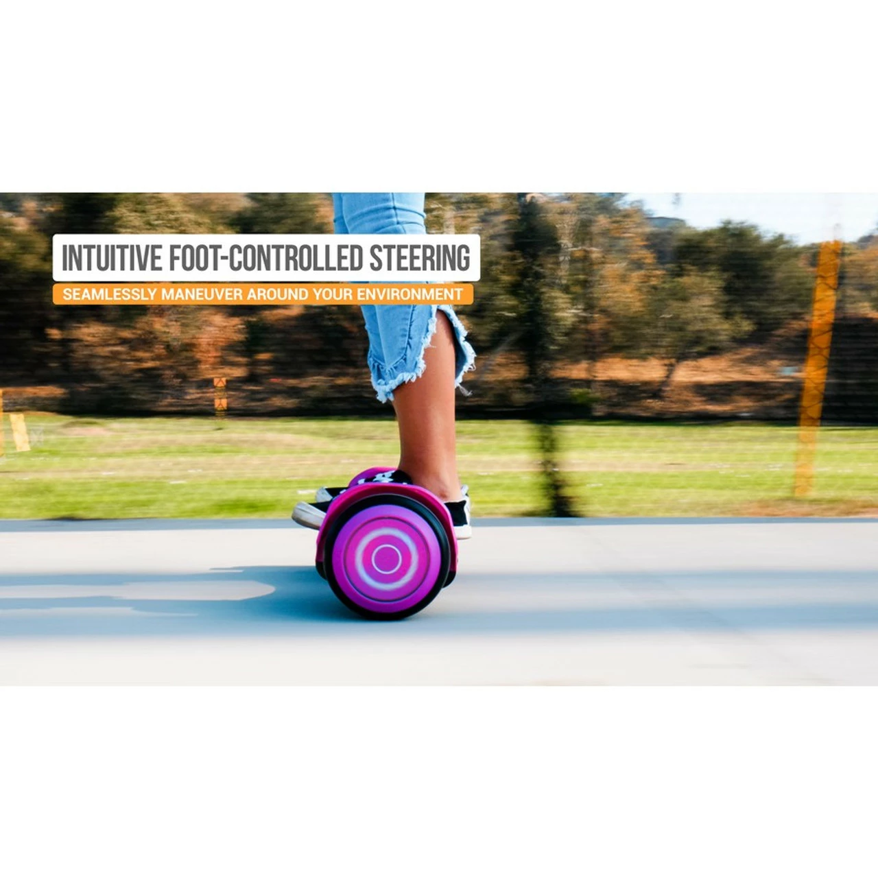 - Lights at Your Feet – The multi-color LED lighted wheel hubs and the blue front facing LED light bars shine together when you’re hovering.
