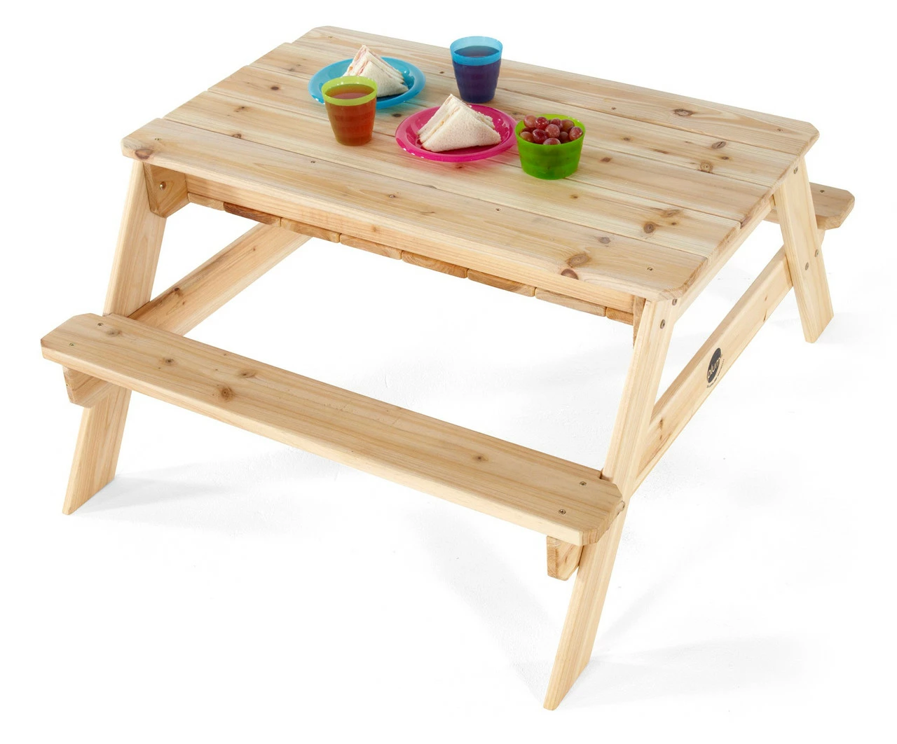 The Plum® Wooden Sand and Picnic Table is a space-saving activity table combining outdoor dining with sensory sand play.