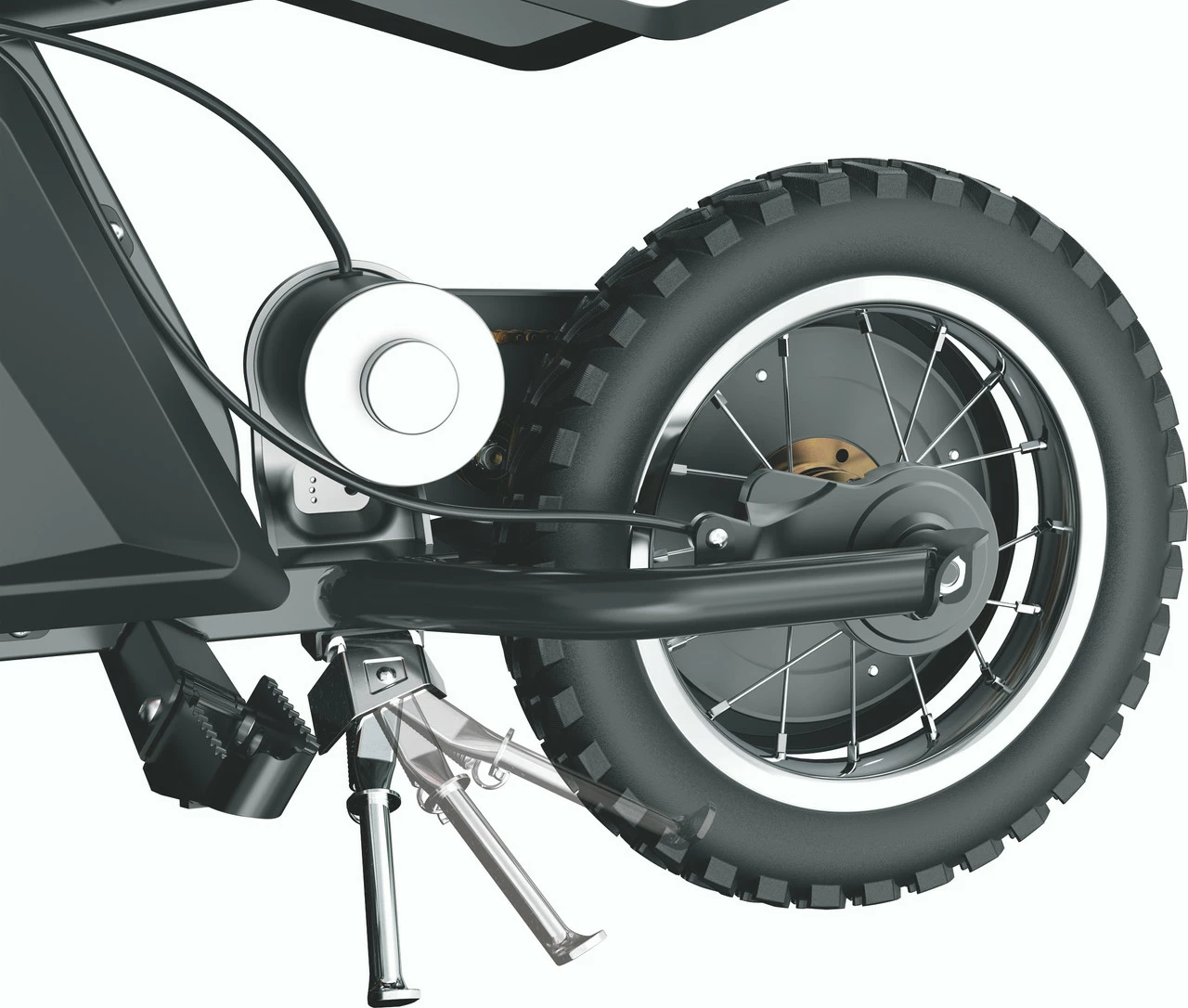 - Features a crossbar reinforced handlebar, spoked wheels with 12” pneumatic, knobby tires, retractable kickstand, and hand-operated rear brake