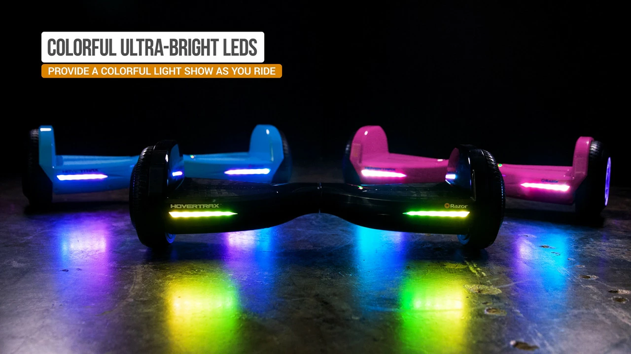 • Prismatic Light Show – The colorful LED lighted wheel hubs and front-facing light bars create a prism of color wherever you hover.