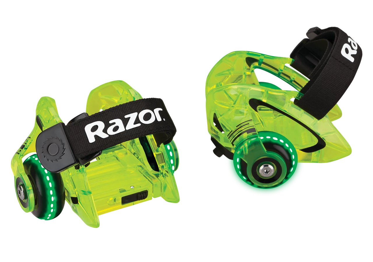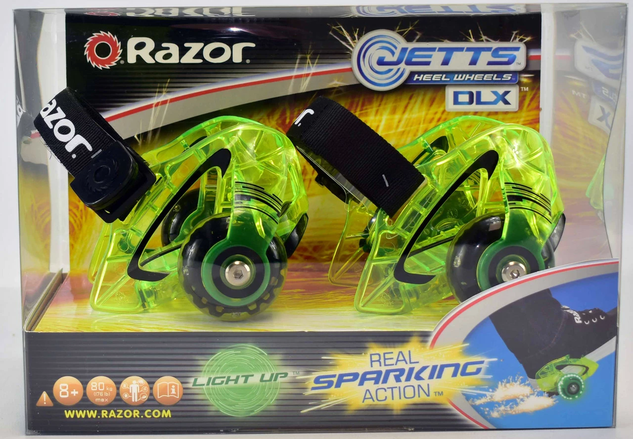 Put your sneakers into warp drive with the Razor Jetts DLX heel wheels. The glowing, LED wheels and translucent, polycarbonate frame will take you to another dimension of fun, with an extra burst of flashing sparks when you really want to light it up. Featuring our “quick click” hook-and-loop strap, the Jetts DLX will have you ready to blast off in a flash.