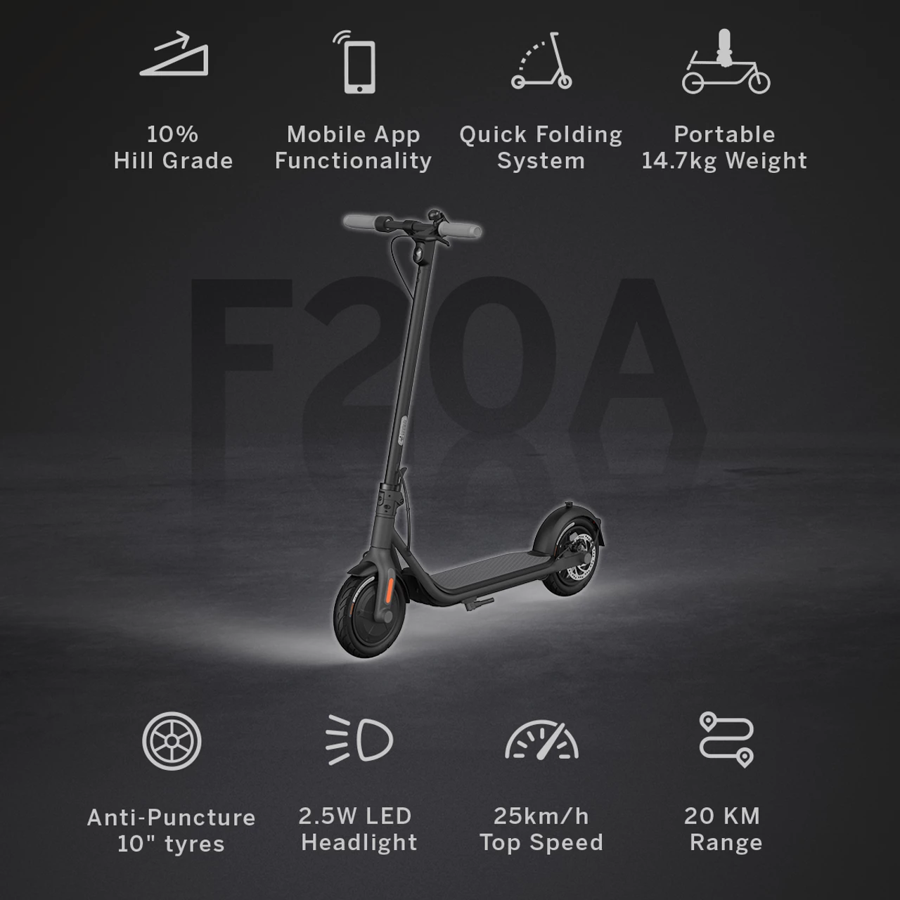 10″ highly elastic tyres Make it easier to ride over obstacles, and give you a smoother ride.Cross 5cm high speed bumps easily without stopping,so you don’t have to worry about bumpy gravel roads and numb hands. The Ninebot KickScooter F series is feature rich yet cost effective and offers everything you need in one product: an extended 20 km range, a max speed of 25 km/h, large 10” tyres, foldable design and Bluetooth security lock to keep your Kickscooter safe. Bright Tail Light: Easily switch between the three riding modes, Eco, Standard, and Sports with two clicks on the intuitive LED dashboard, allowing you to ride the way you want. The F Series has a regenerative braking system that turns the scooter into an electric vehicle powered by electricity and recycled energy from riding. Energy will be collected from regenerative braking and distributed when you need a boost. Connect the F Series with the Segway-Ninebot app via Bluetooth to monitor your riding status and data, lock your kickscooter and upgrade the firmware and enhance the overall riding experience. The Smart-BMS system, which is developed based on the safety management experience of 300 million lithium batteries and has undergone 7 years of technological iteration and upgrading, has enabled the lithium battery to have a longer service life, safer discharge and more accurate power display.