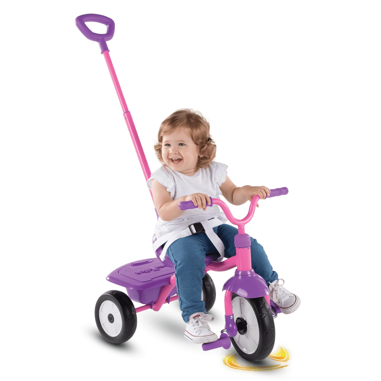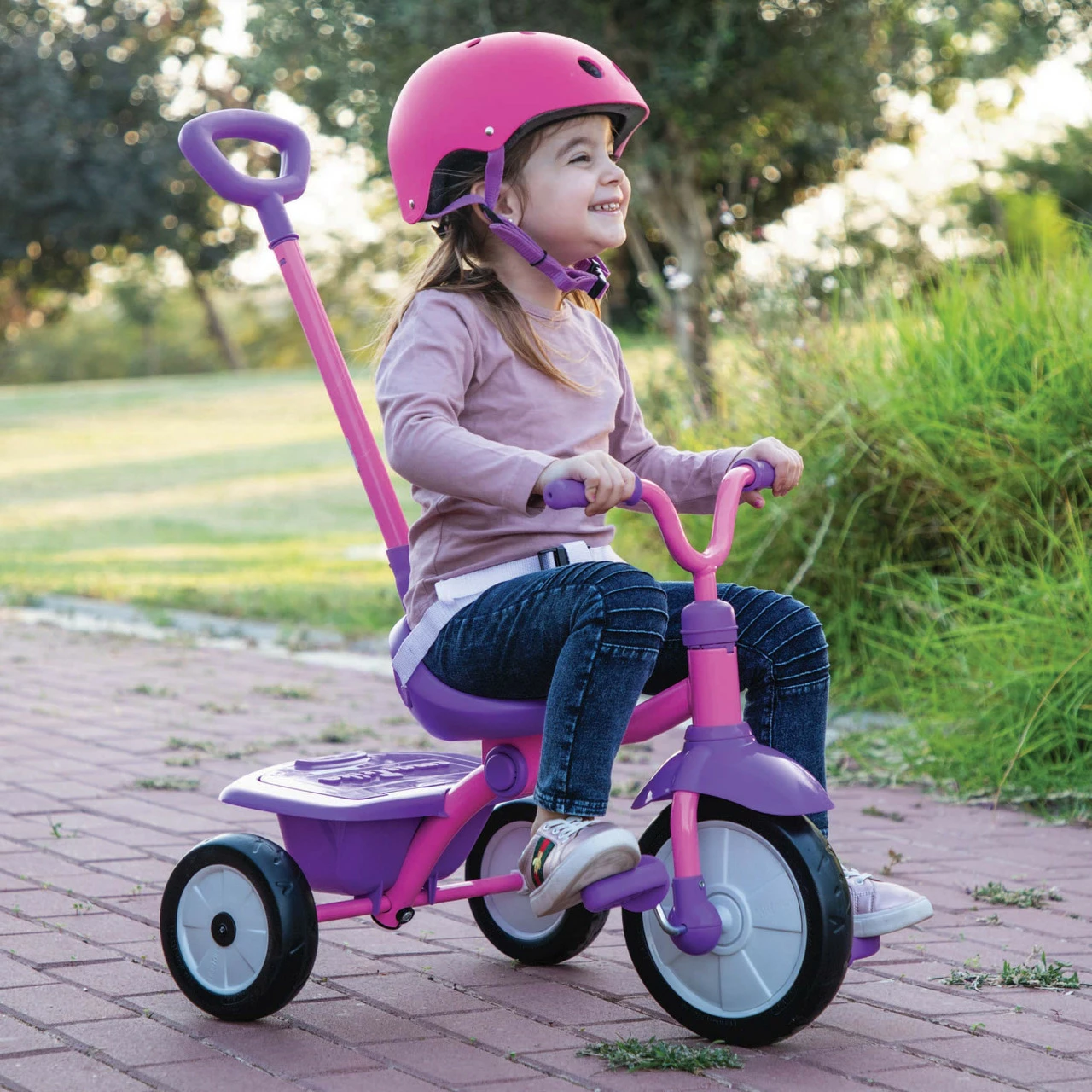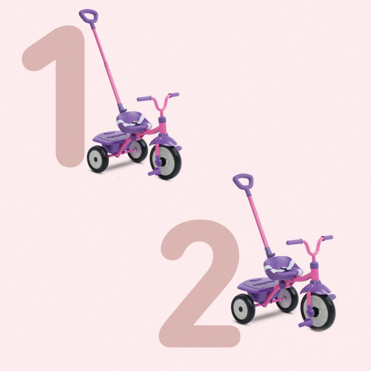 Stage 1: Training Trike. Baby learns how to pedal while you steer and control the trike. Baby builds confidence, balance & motor skills before riding off on their own.