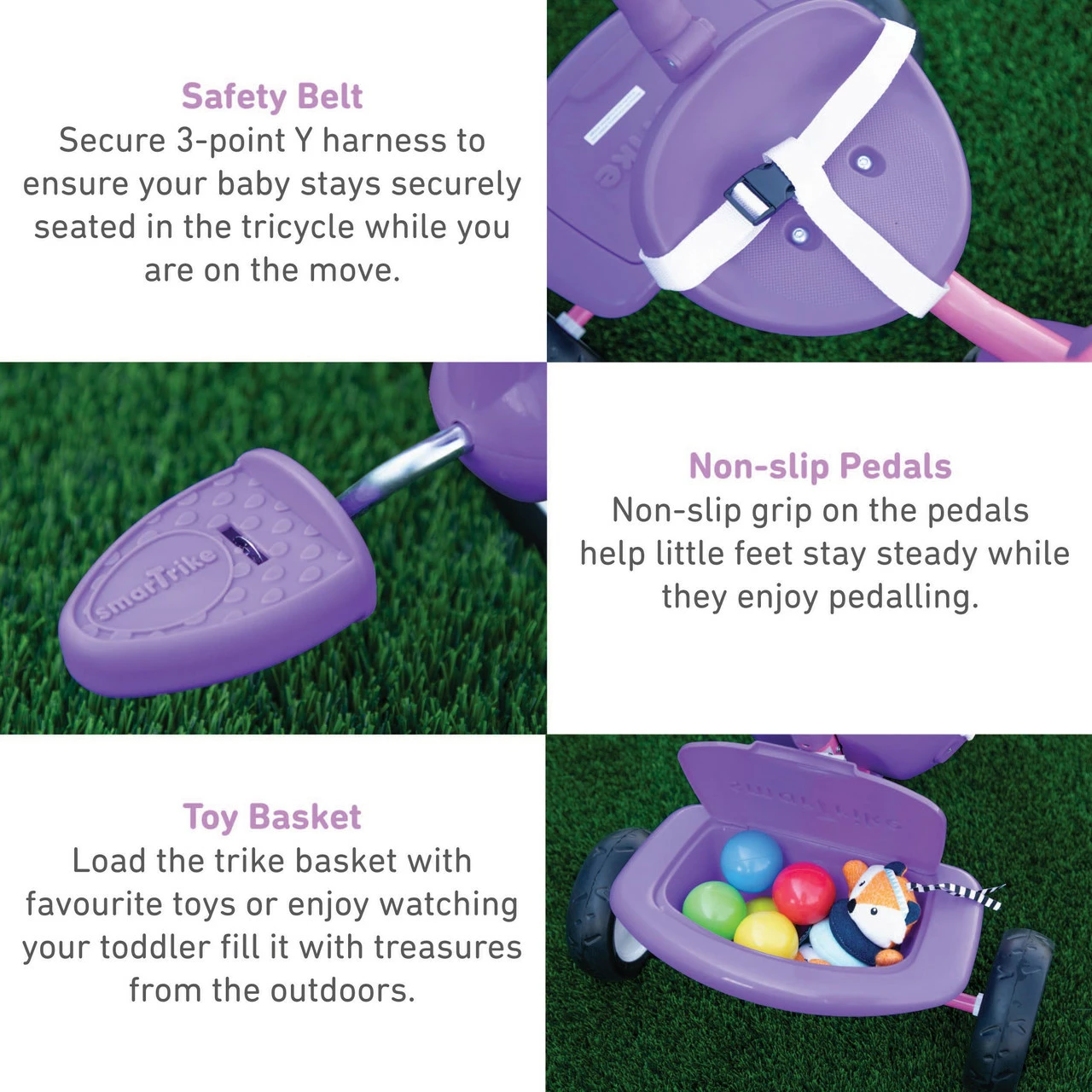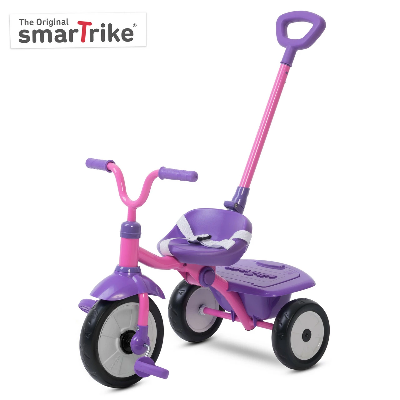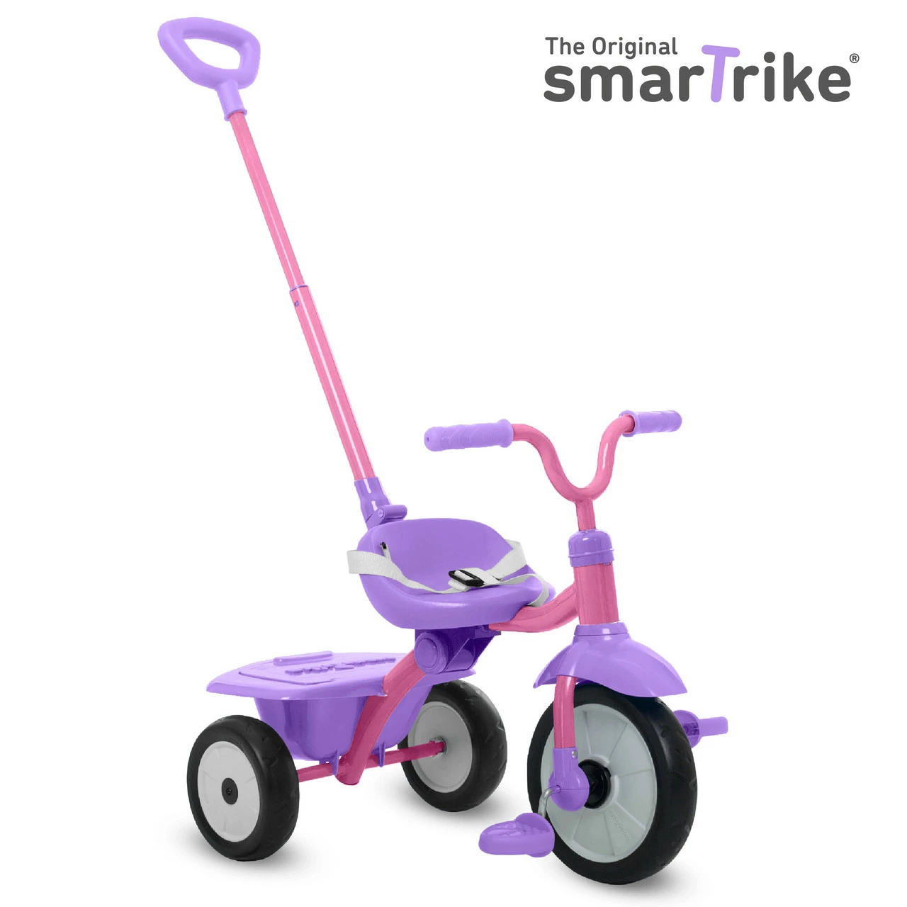 Stage 1: Training Trike. Baby learns how to pedal while you steer and control the trike. Baby builds confidence, balance & motor skills before riding off on their own.