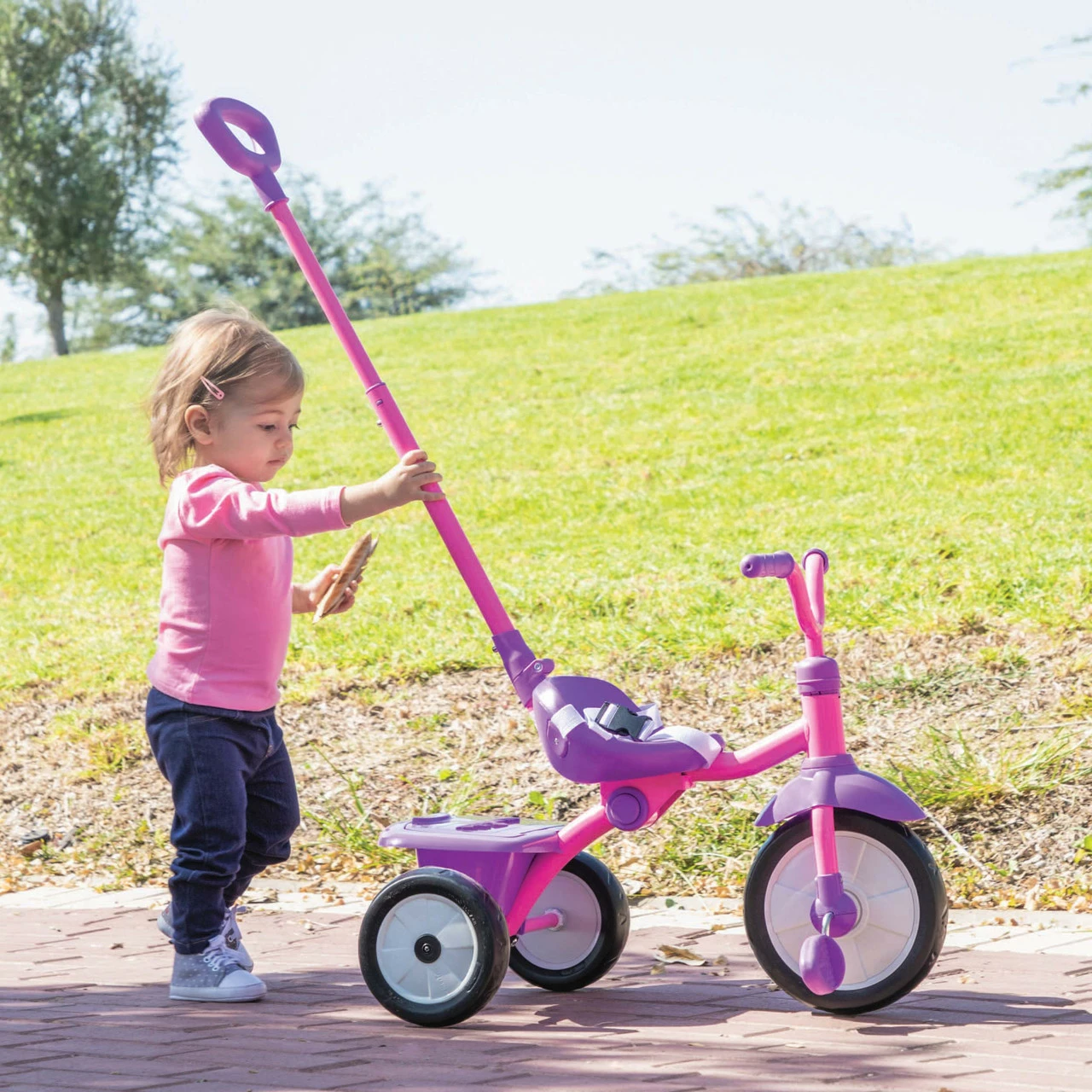 Stage 2: Classic Trike. Remove the parent handle and push in the clutch on the pedals. Now toddlers can pedal all on their own with confidence, while exploring the great outdoors.