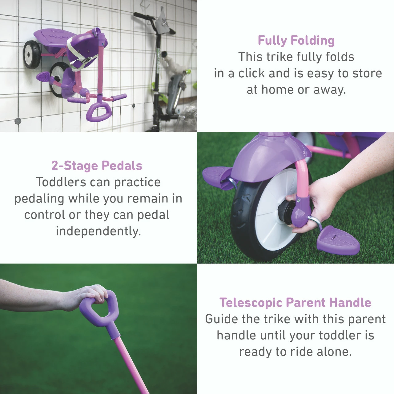 In two transformative stages, The Folding Fun converts easily from a parent guided baby trike to an independent trike. The Folding Fun includes smooth ride EVA wheels, non-slip pedals, and an adjustable seat with seat belt to keep your child comfortable and secure while on-the-go.